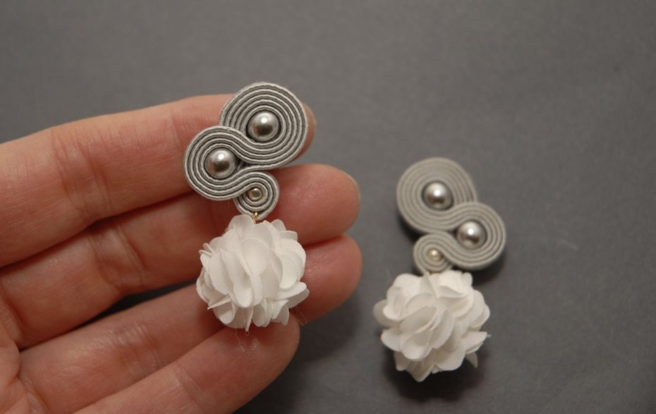 oferuję kolczyki zrobione techniką sutasz, ozdobione koralikami i kwiatkami z materiału