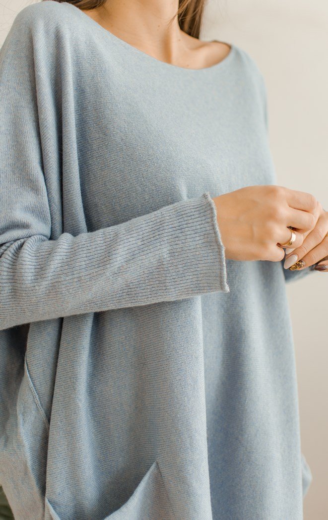 Luźny, szaro-błękitny sweter z wełną merino.