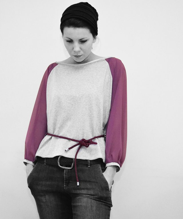 Bluzeczka wykonana została z szarej dzianiny dresowej oraz fioletowego szyfonu. Szerokie, transparentne rękawy oraz fragment tyłu bluzeczki. Przy dekolcie wykończona srebrną ekoskórą, wiązana w pasie grubym sznurkiem. Rozmiar M