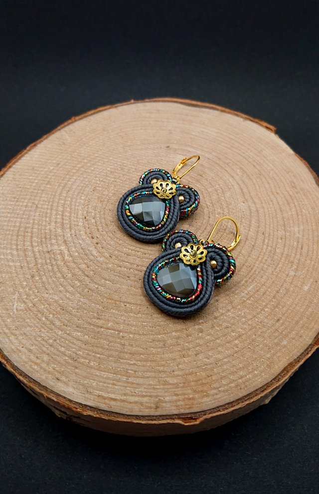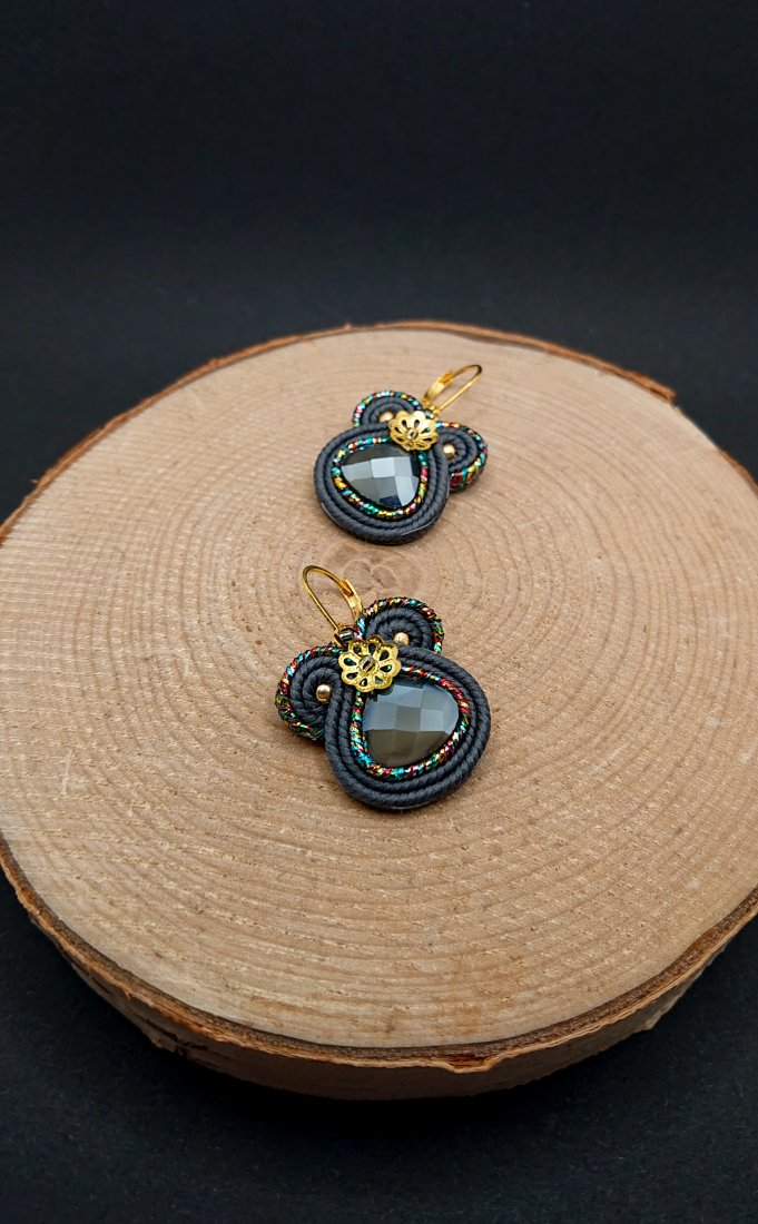 Szklane kryształki otoczone multikolorowym oraz ciemnoszarym sznurkiem sutasz z dodatkiem drobnych koralików. Kolczyki zawieszone na biglach angielskich w kolorze złotym.