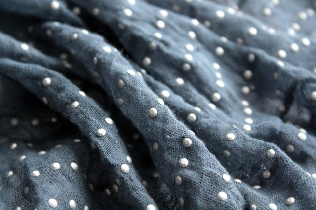 Miękki, bardzo delikatny szal o luźnych splotach w kolorze szaro-niebieskim. Na brzegach szal ozobiono drobniutkimi elementami, które zostały przyklejone do tkaniny (nie zahaczają ubrań z drugiej strony tak jak dżety czy ćwieki).
