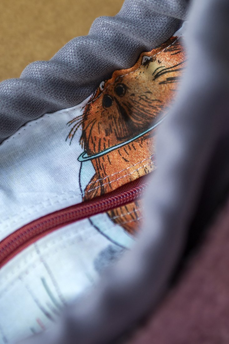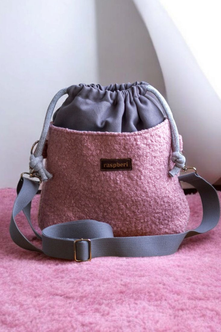 Wykonana z szarej tkaniny. Z przodu oraz z na tyle torebki kieszenie (np. na telefon czy chusteczki) z różowego "baranka". W środku kieszonka zapinana na suwak.