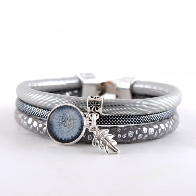 Delikatna, stylowa bransoletka wykonana z błyszczących i nakrapianych rzemyków w kolorach szarym i srebrnym.