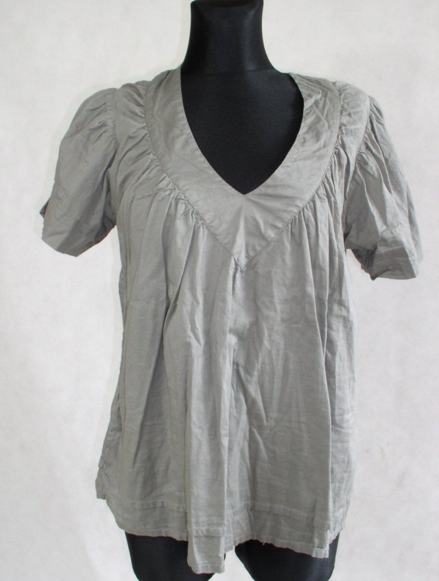 Bluzka dwuwarstwowa,spód dłuższy.Dekolt w literę V,przód marszczony do plisy przy dekolcie.Rękaw krótki,szeroki,marszczony.Materiał bawełna.Rozmiar L/XL.Stan bardzo dobry.Długość 67 cm.pod pachami 102 cm.