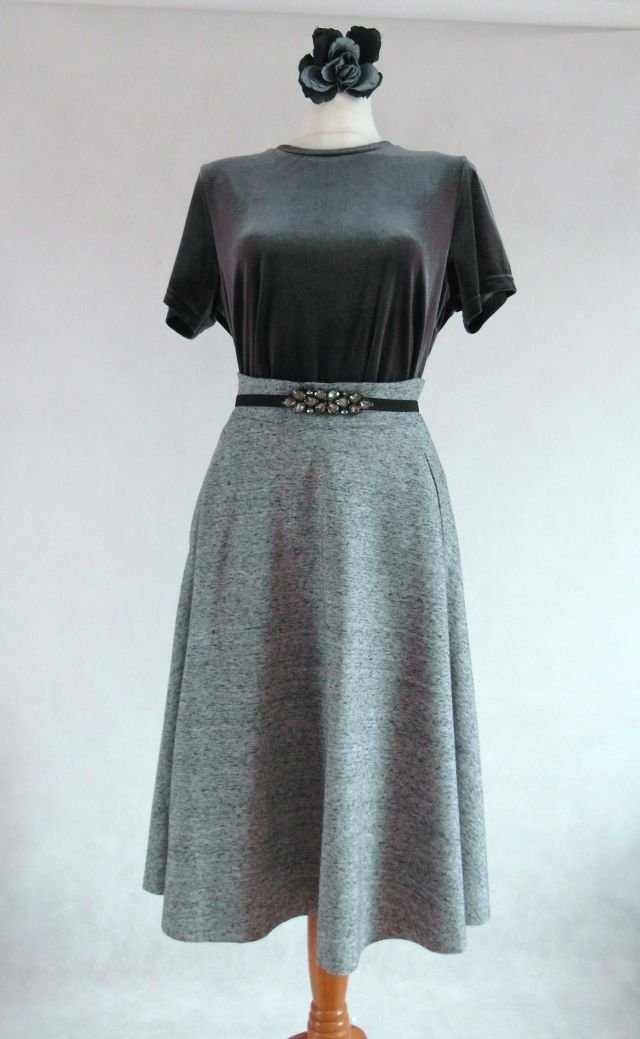 szary melanż, fason "A"na szerokim pasie, zapinana z tyłu na suwak. Na przodzie po bokach dwie wsuwane kieszenie.Dół zakończony "na surowo".