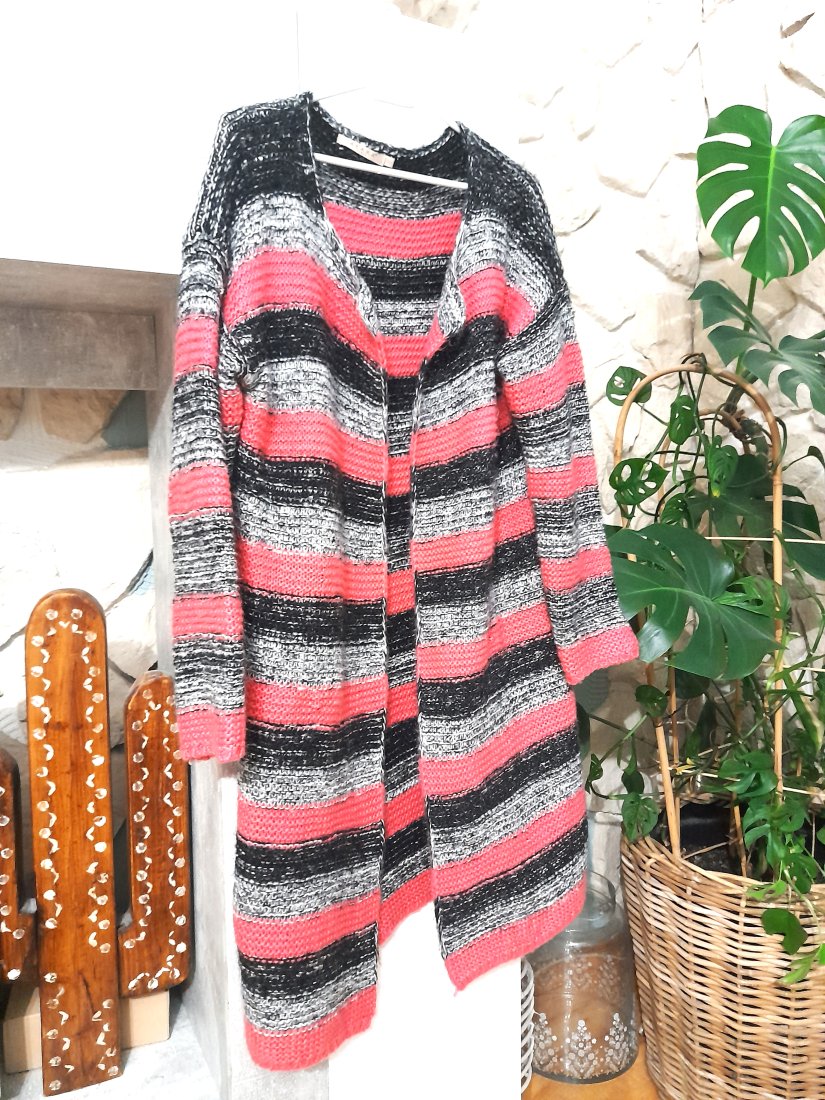 Śliczny kardigan w tonacji zgaszonej szarości, czerni i fuksji.