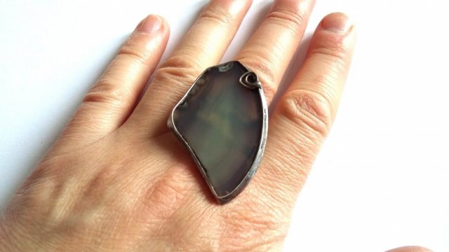 Pierścionek wykonany z miedzi, cyny i agatu. Obrączka posrebrzana, regulowana. Wymiary max ok. 4,3 na 2,8 cm.