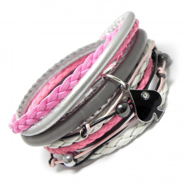Bransoletka wykonana została z rzemieni skórzanych i ekologicznych, kuleczek hematytu oraz elementów w kolorze srebrnym . Będzie odpowiednia na nadgarstek 15 cm, podwójnie oplatana.