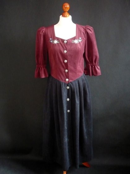 Nowoczesna wersja ludowej-tyrolskiej sukienki. Uszyta z miłego weluru.zapinana na guziki z tworzywa.Dekolt haftowany w szarotki.Rękawy-bufki i gumkowane na dole. W pasie odcinana.spódnica z zaszewkami.