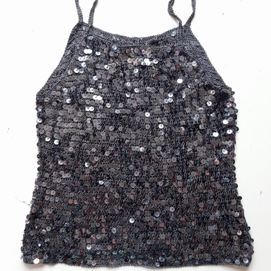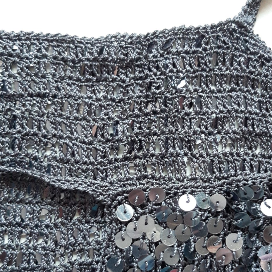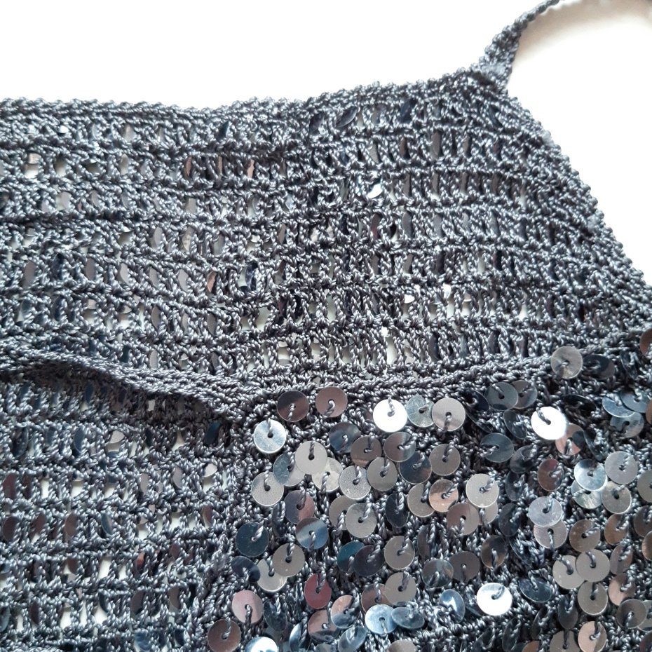 Pod cekinami jest taki ażurowy top z plecionki także top jest przewiewny.