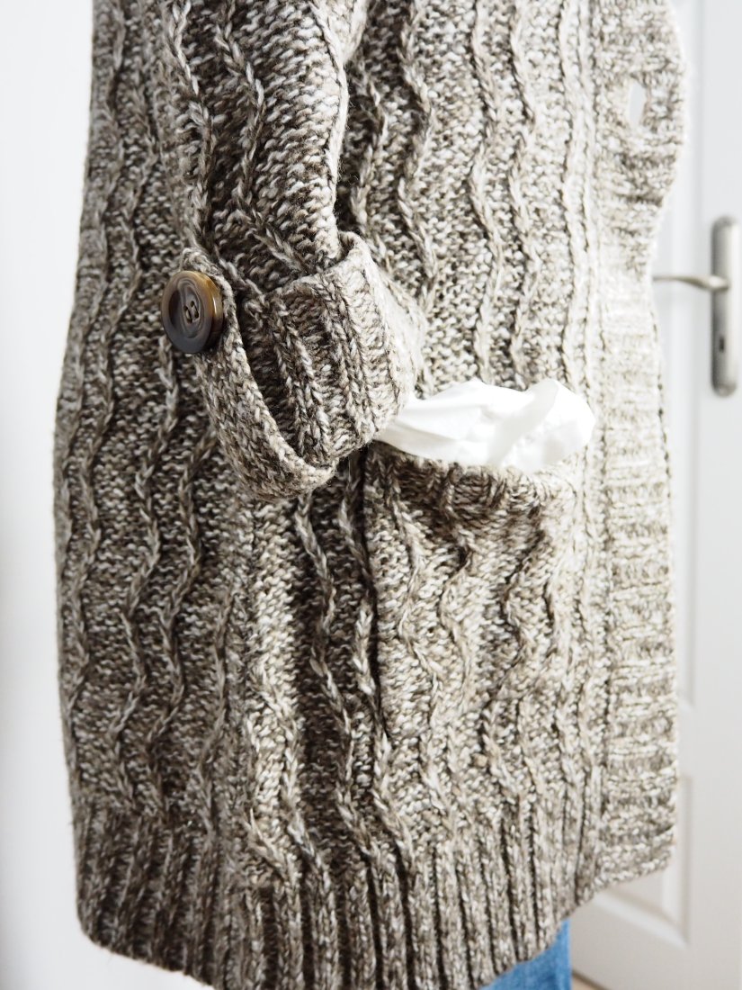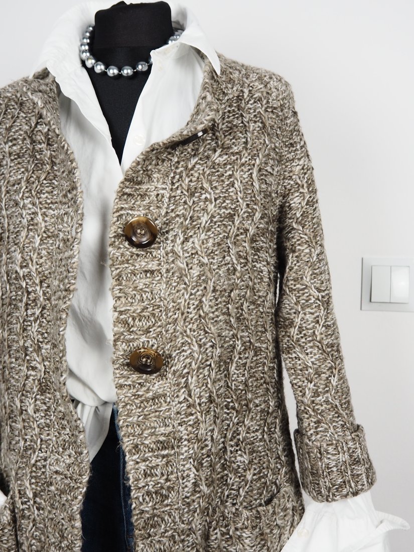 Kardigan sweter, warkoczowy splot