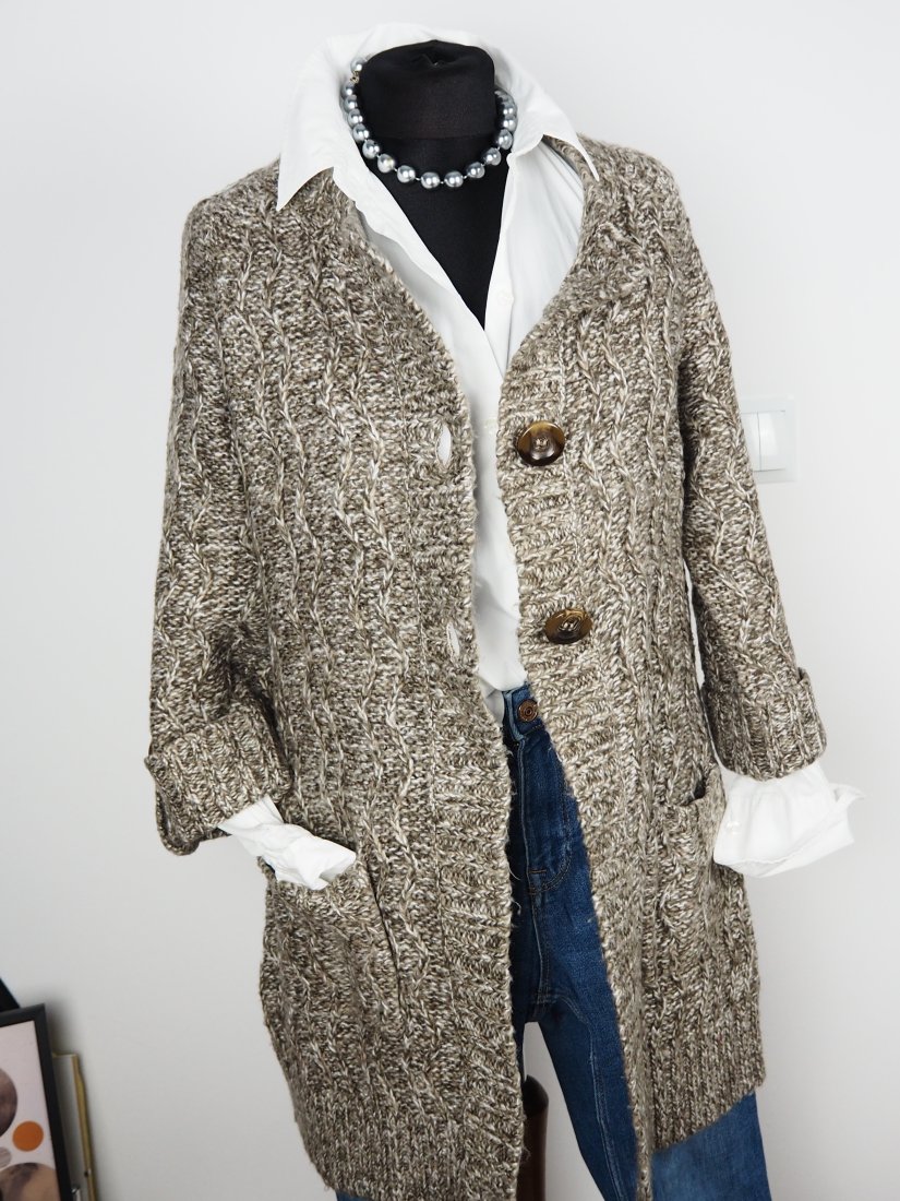 Sweter splot warkoczowy mięsisty handmade modny outfit guziki oversize melanż