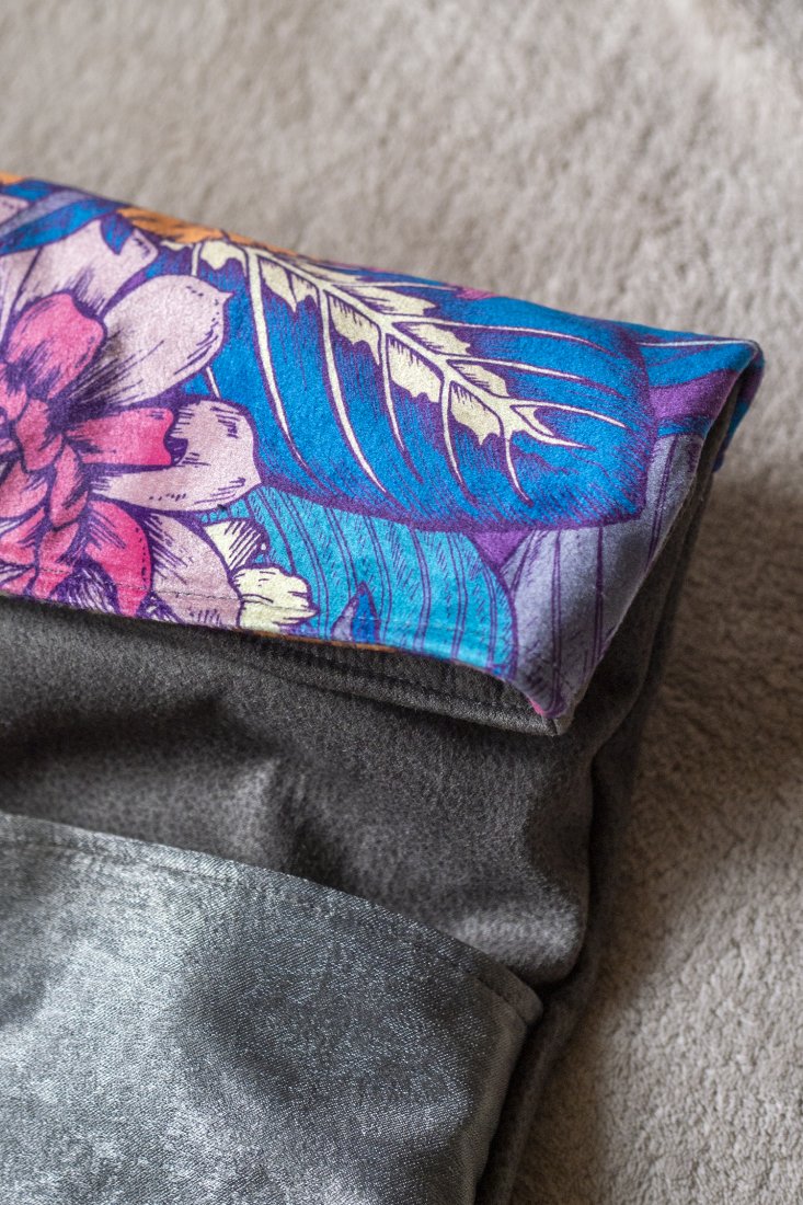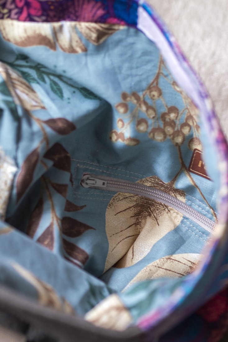 Regulowane paski. W środku laurowa, bawełniana podszewka w kwiaty oraz mała kieszonka na suwak.