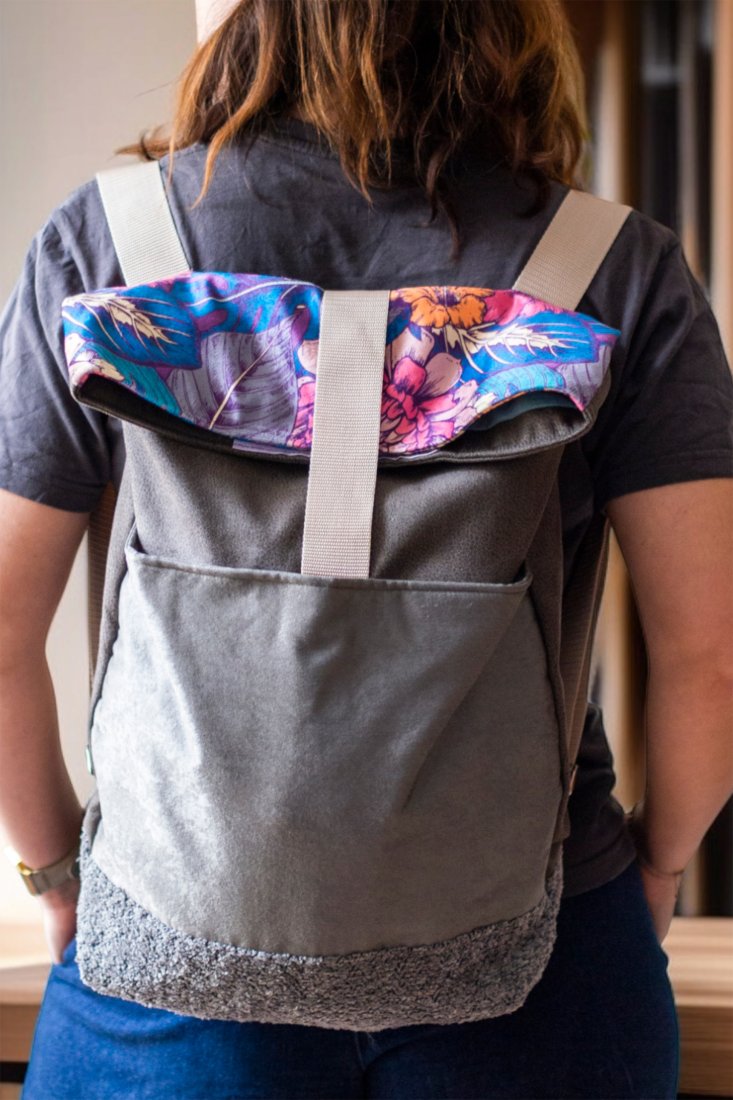 Duży, damski plecak miejski składany i zapinany na rzep wykonany z kilku rodzajów tkanin.