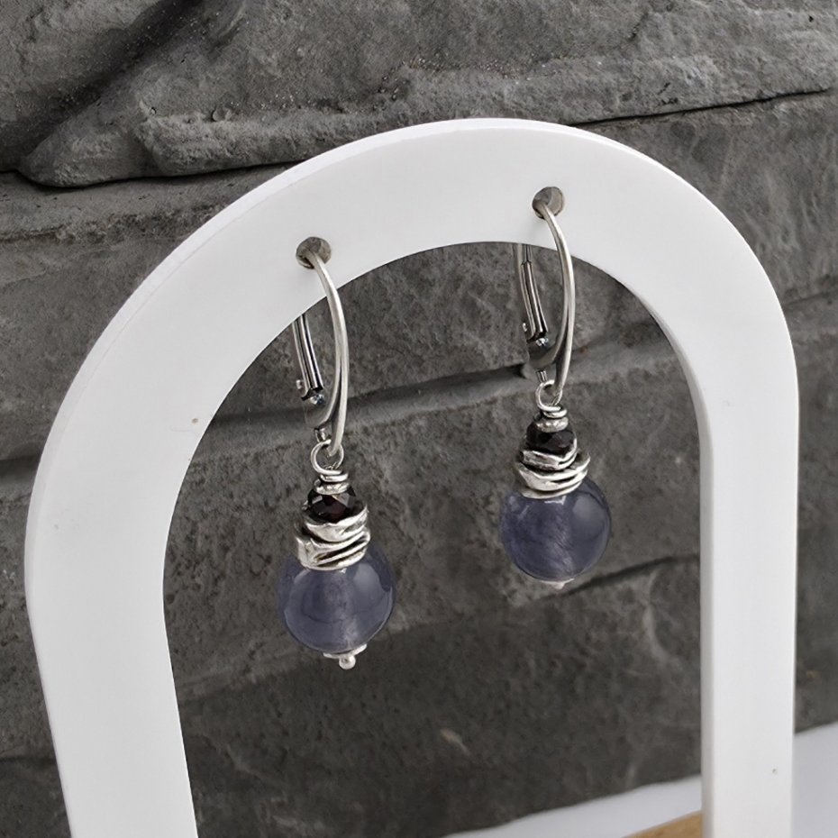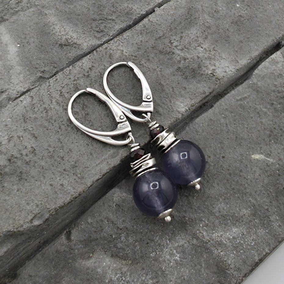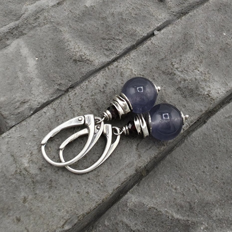 Minimalistyczne, kobiece kolczyki. Wykonane w całości ze srebra próby 925 oraz gładkich kulek szarego jadeitu wielkości 1 cm i szlifowanych oponek granatu 4 mm. Zapięcia typu angielskiego, mogę zamienic na inne, albo wykonac te kolczyki z innymi kamieniami. Długość całych kolczykow to ok. 3,8 cm. Ozdobnie zapakowane.