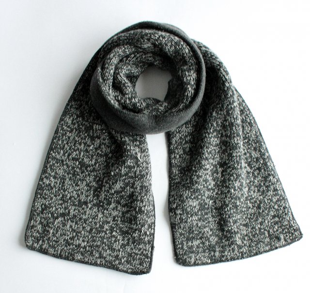Ciepły, dwustronny szal w odcieniach szarości. Z jednej strony melanżowa dzianina, zaś z drugiej jednolity, miękki polar, dzięki czemu szal jest bardzo ciepły.
