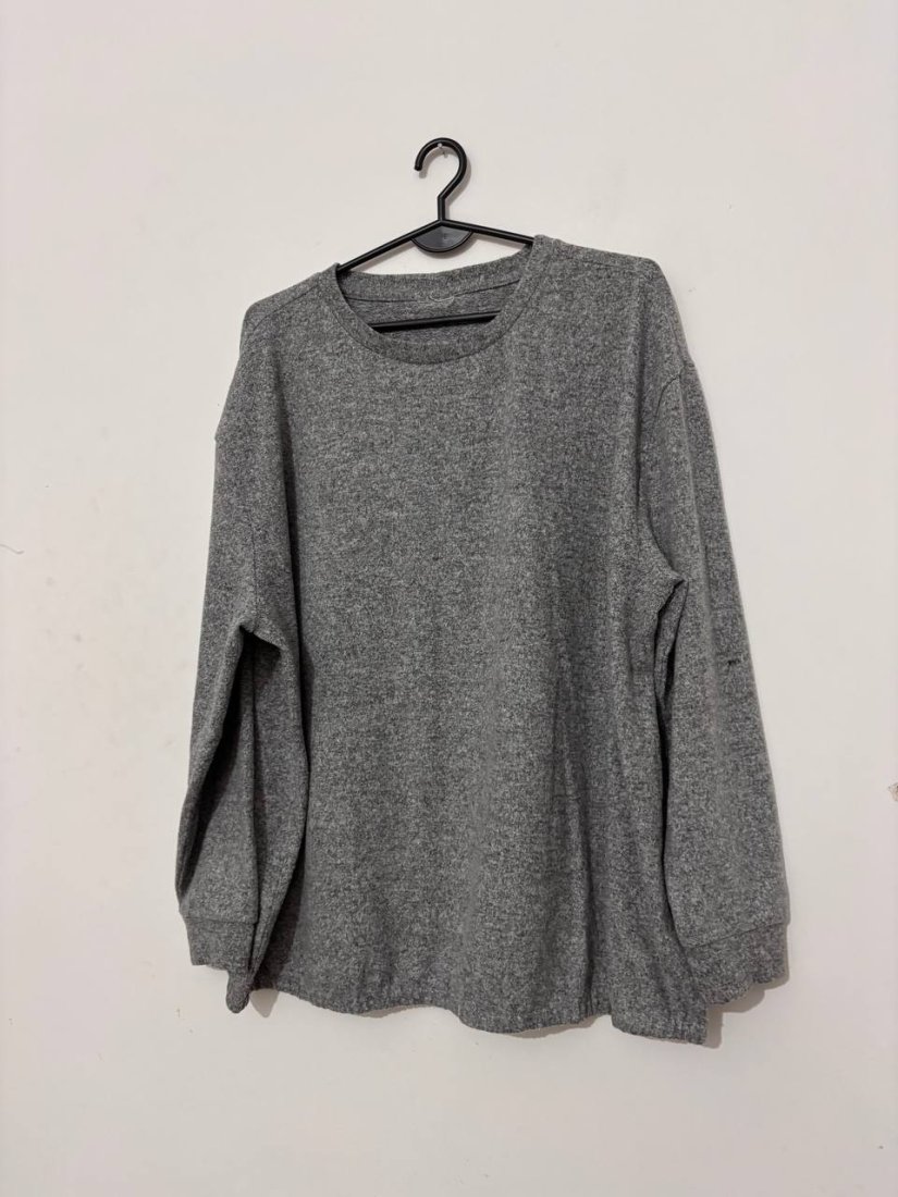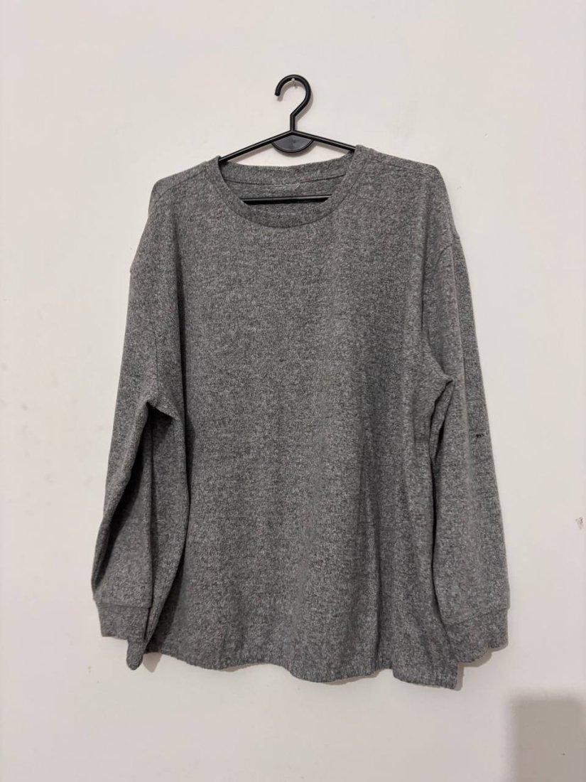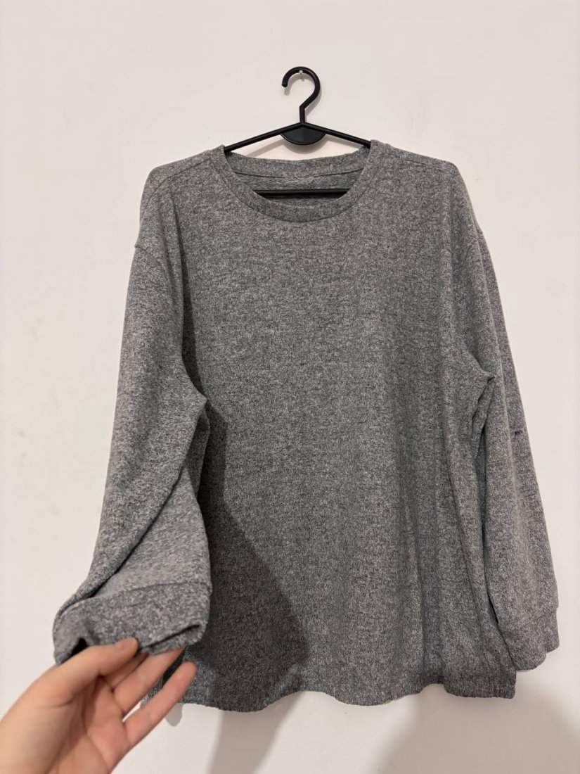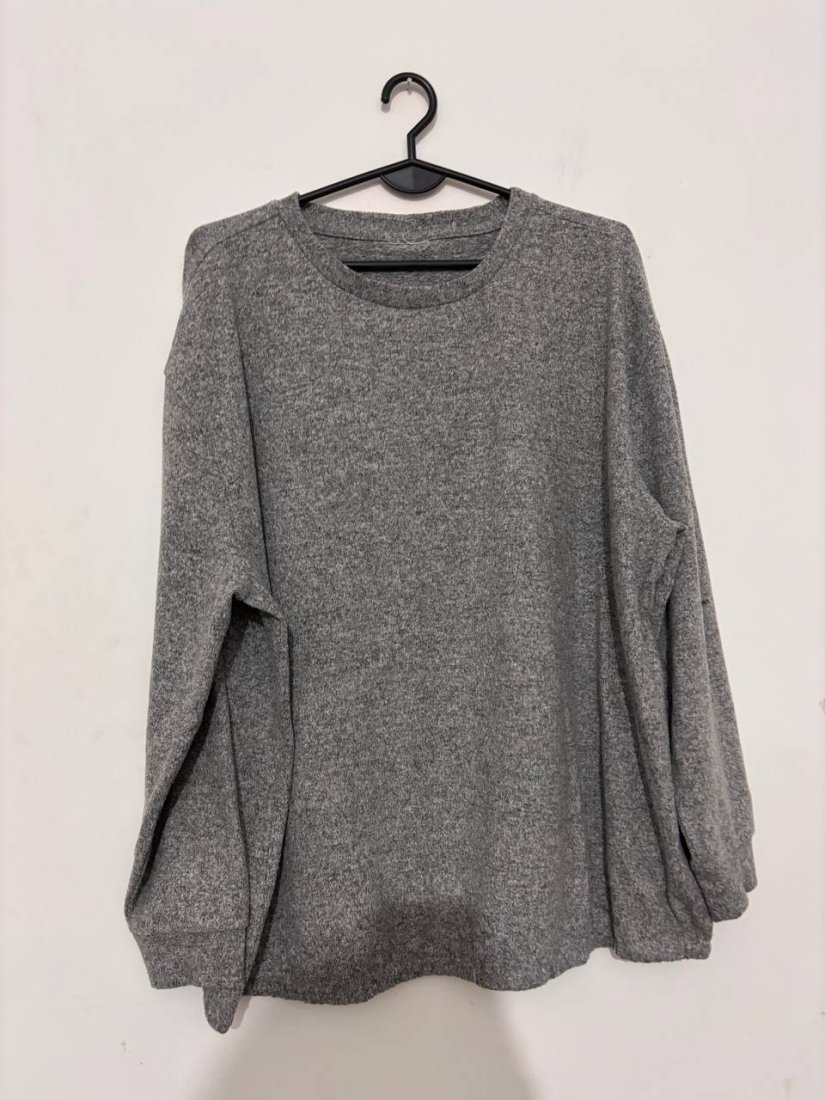 Miękki, bardzo przyjemny w dotyku szary sweter o kroju oversize. Idealny na chłodniejsze dni — ma luźne rękawy i klasyczny okrągły dekolt. Brak metki, ale materiał jest miękki, elastyczny i grzeje jak mieszanki akrylu/poliestru.