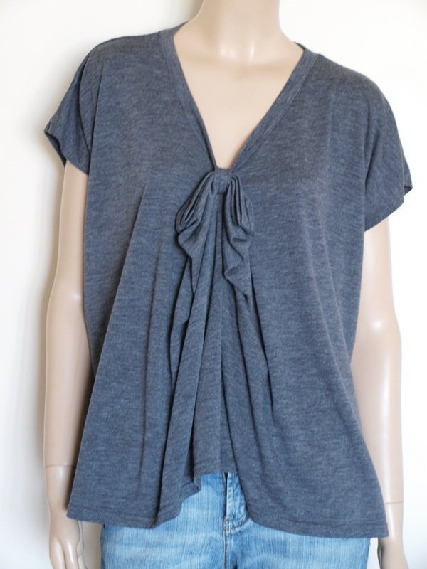 oversizowy podkoszulek szarym melanżu. po rozłożeniu ma kształt prostokąta. będzie dobrze wyglądał na osobach z małym biustem. brak metek jaka to dzianina. na manekinie o rozmiarze 38. niewielkie ślady uzytkowania. Podaję wymiary mierzone na płasko;