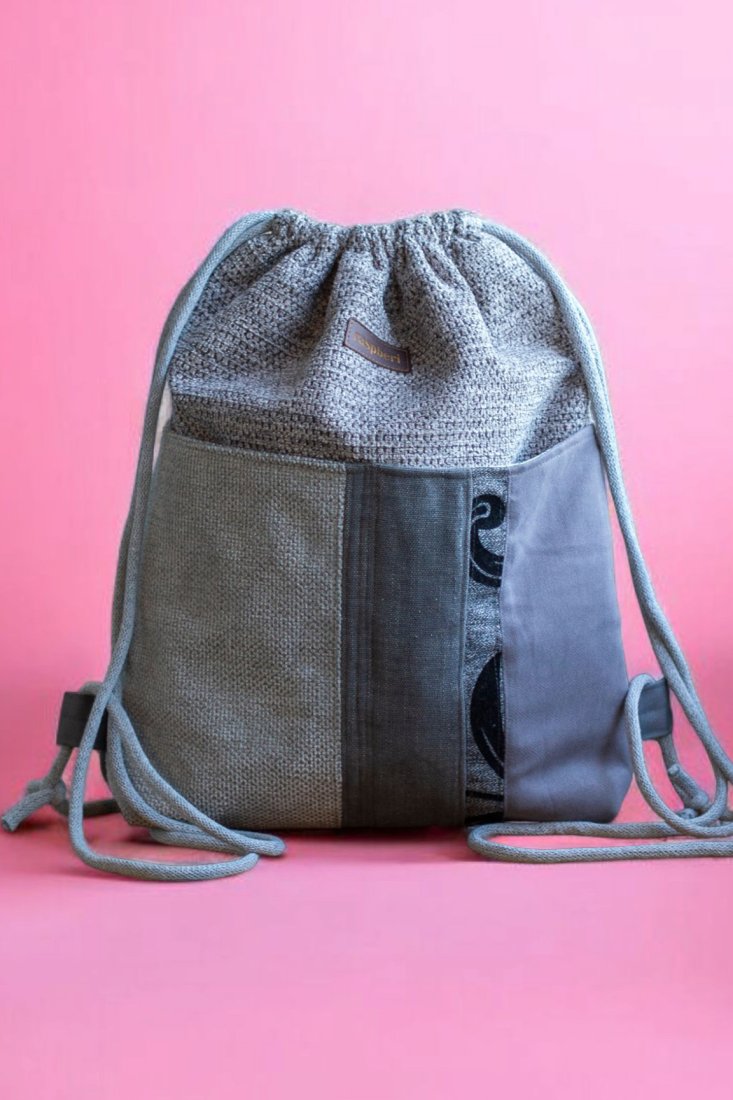 Workoplecak z plecionej tkaniny w kolorze szarym.