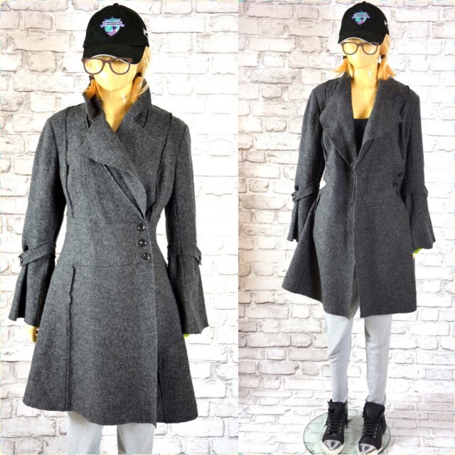 Wiosenny szary płaszczyk o poszerzanym kroju, zapinany na guziczki, z kołnierzykiem, rękawy poszerzają się do dołu, świetnie skrojony, w pasie dopasowany, następnie stopniowo do dołu się poszerza rewelacyjnie się układając. Płaszcz posiada surowe wykończenia.