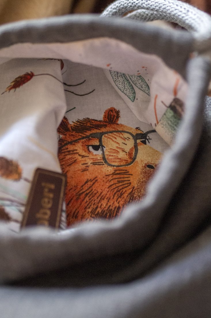 Biała, bawełniana podszewka w kapibary, okrągłe dno. Całości dopełnia gruby, bawełniany sznurek w kolorze jasnoszarym.