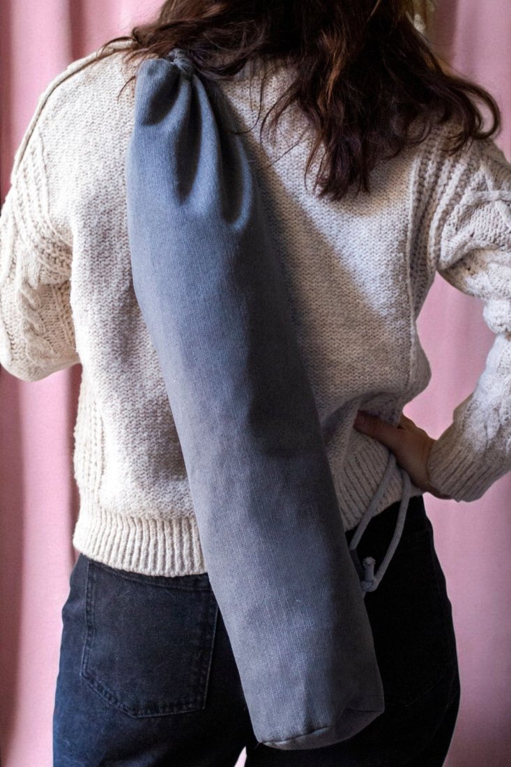 Plecak worek wykonany z szarej tkaniny o delikatnym splocie. Jego kształt sprawia, iż idealnie nadaje się na pokrowiec na matę do jogi.