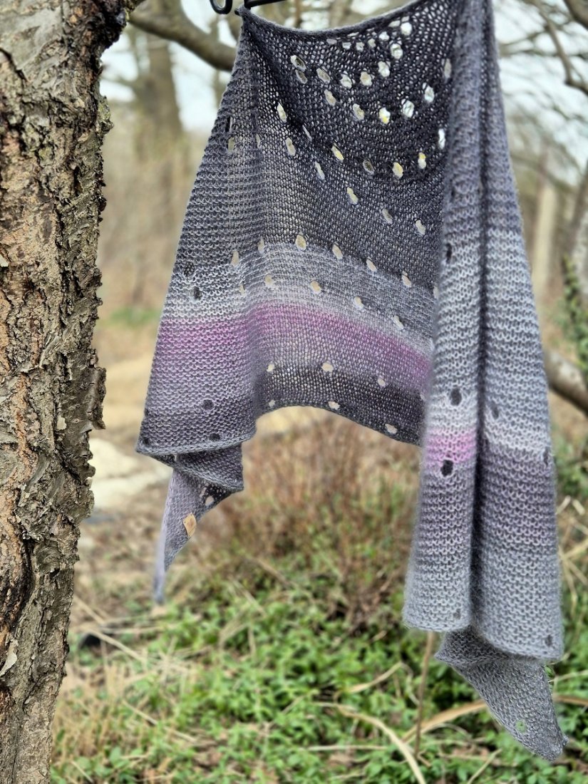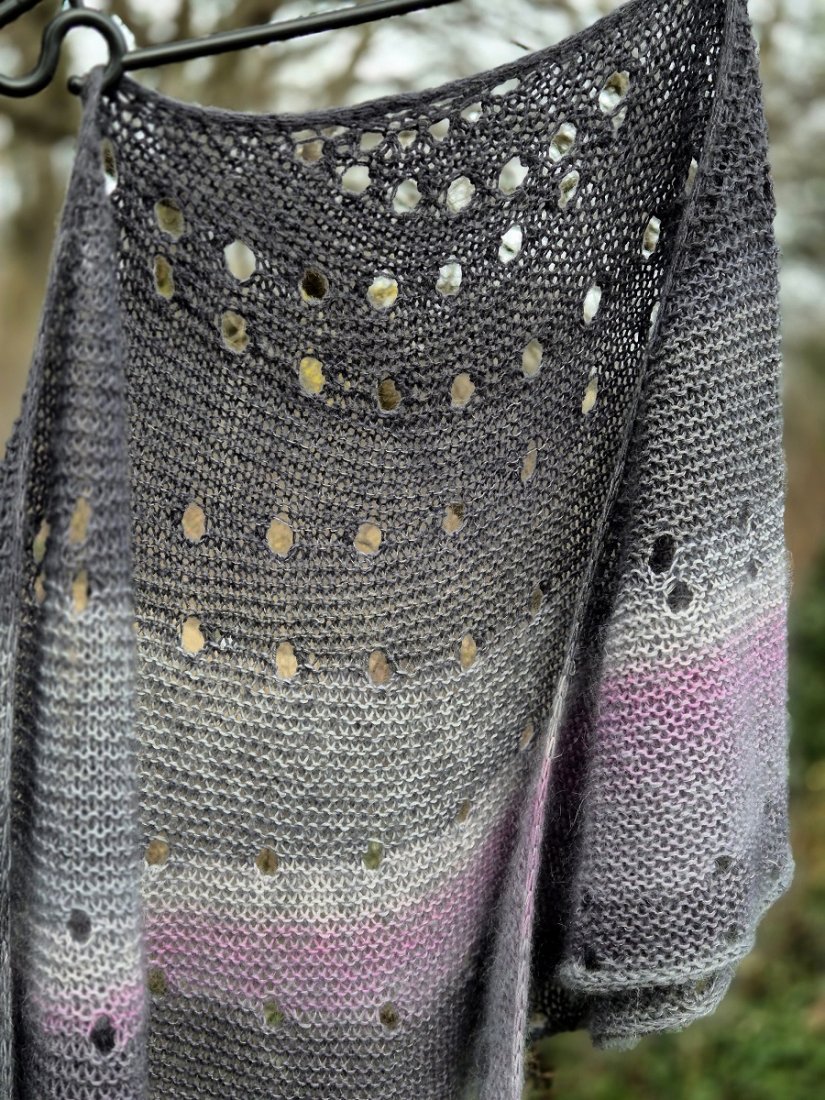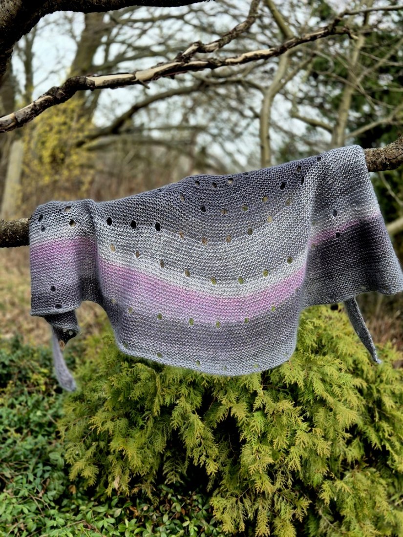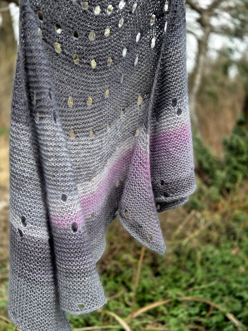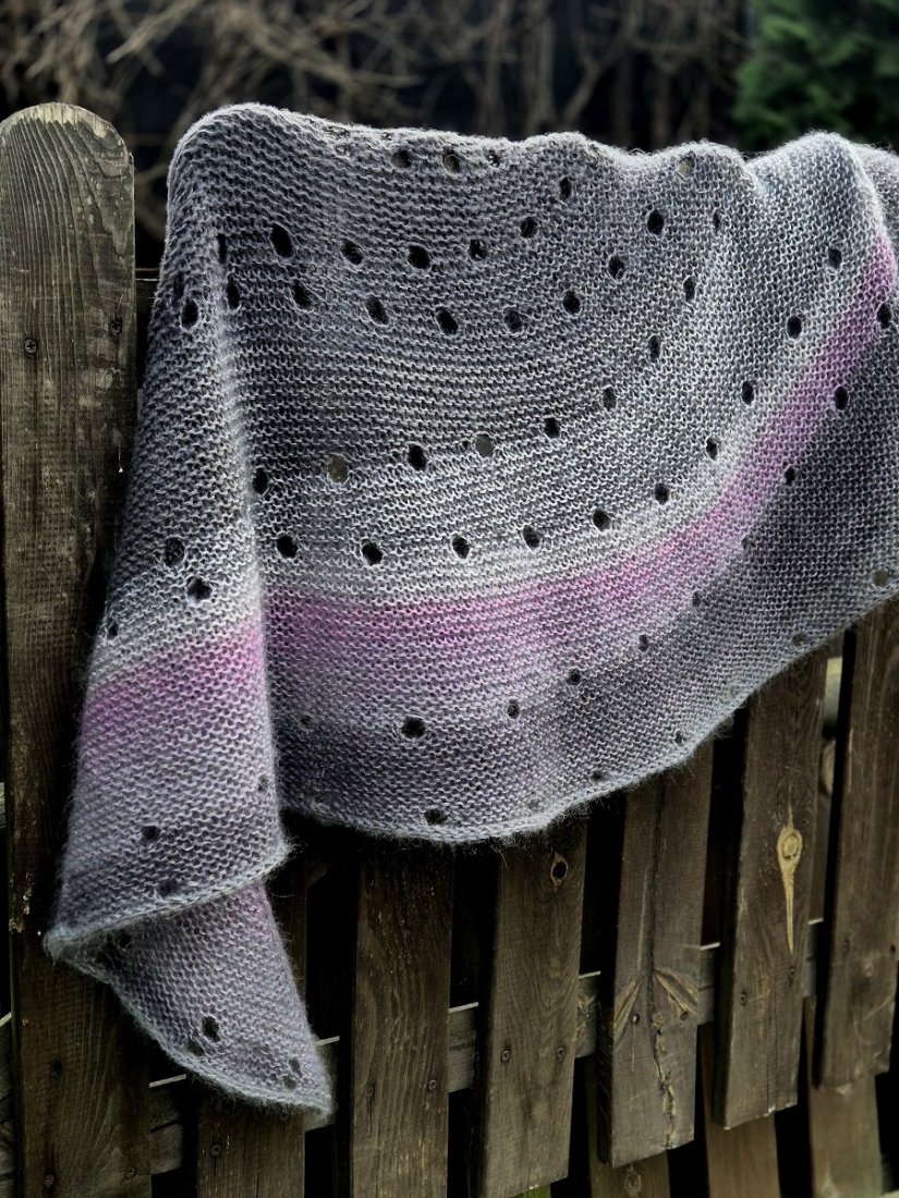 Niezwykle kobiecy szal w kształcie półkola, który może służyć cały rok: jako ochrona przed chłodem lub element stylizacji. Miękki i lejący. Całość utrzymana w szarościach z delikatnie różowym akcentem. Wykonany ręcznie na drutach z wysokiej jakości włóczek.