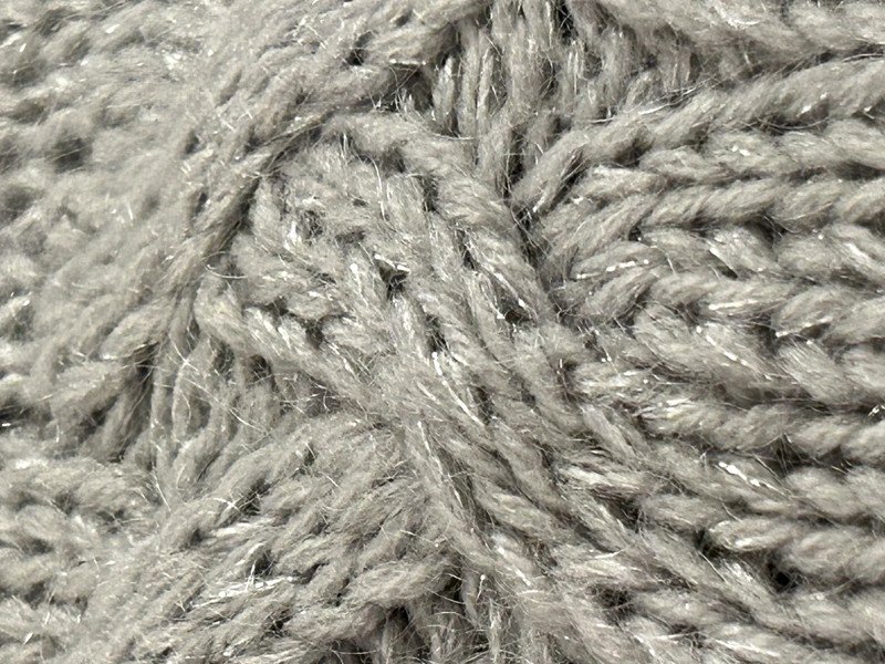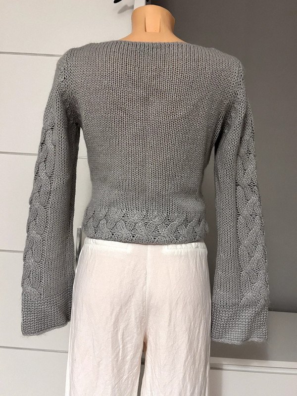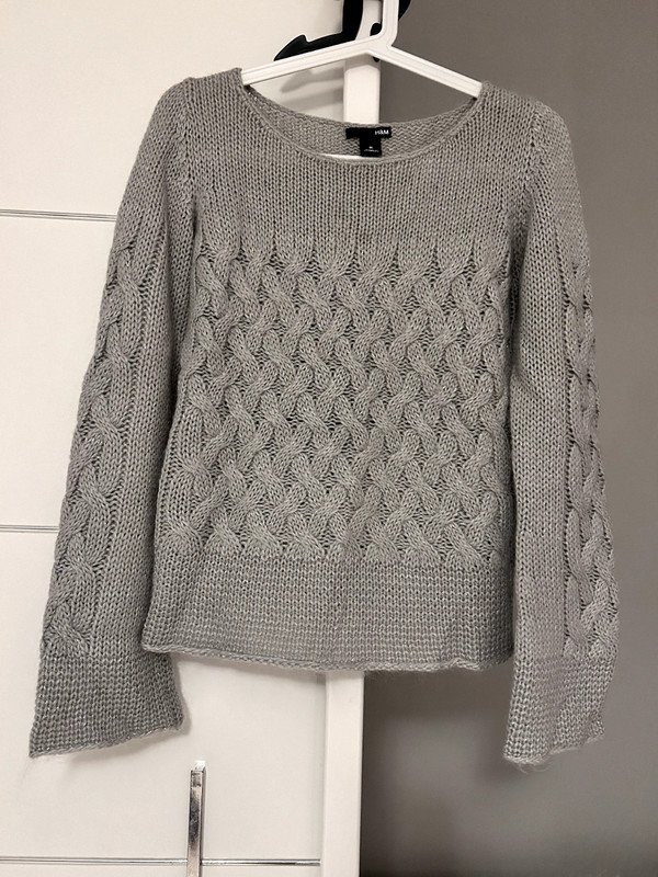Szary sweterek marki H&M. Jest bardzo ciepły, ponieważ posiada 22% moheru w składzie. Ma piękny gruby ozdobny splot. Nadaje się dla zmarzluchów.