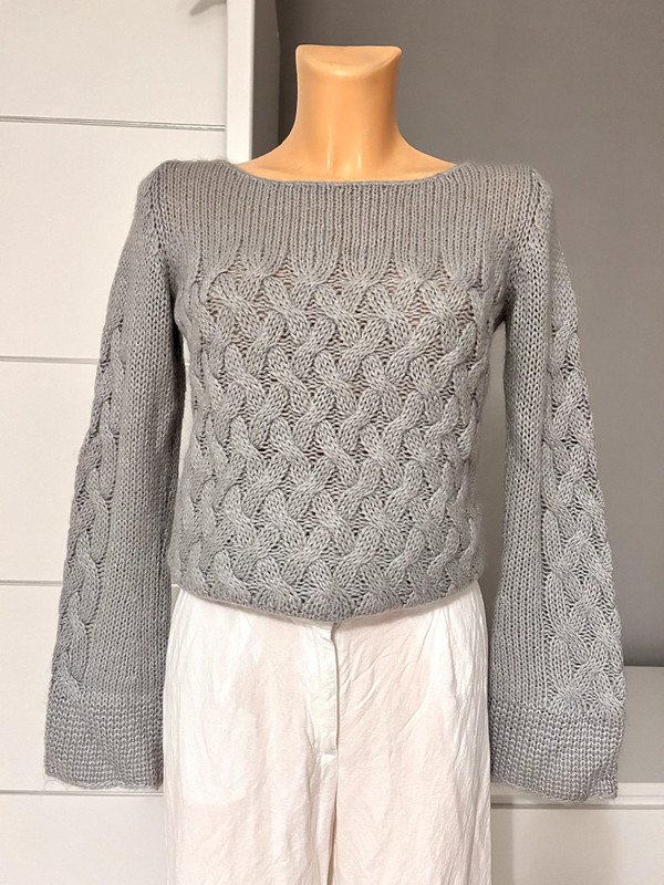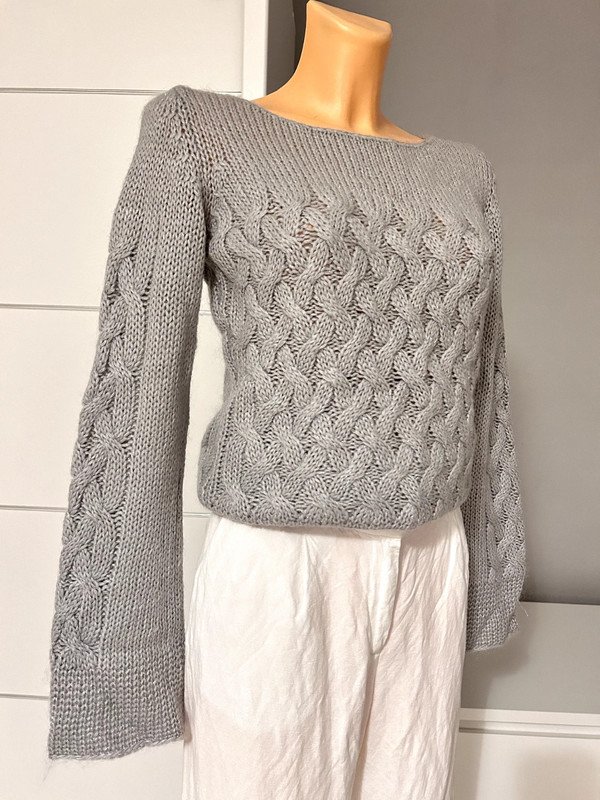 Szary sweterek marki H&M. Jest bardzo ciepły, ponieważ posiada 22% moheru w składzie. Ma piękny gruby ozdobny splot. Nadaje się dla zmarzluchów.