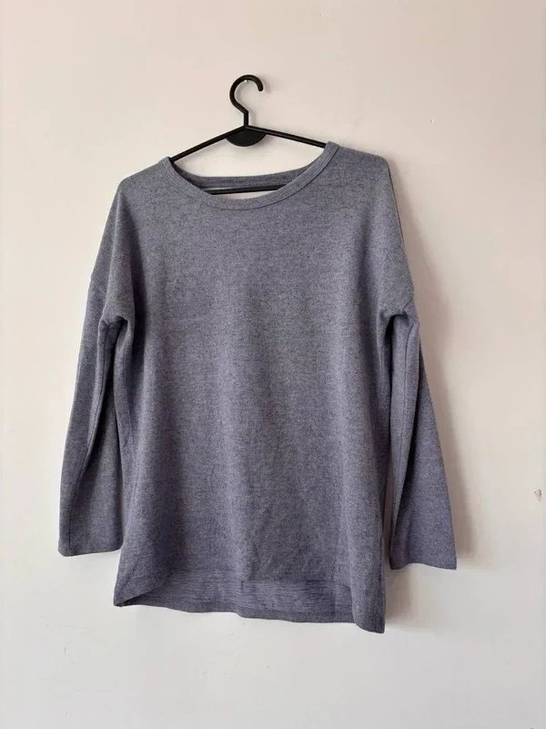 Szary sweter o prostym, minimalistycznym kroju z głębokim dekoltem w serek i ozdobnym wycięciem na plecach.