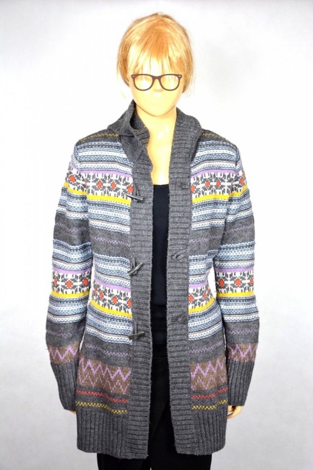 Szary dłuższy sweter z kapturem we wzory zapinany na kołki.