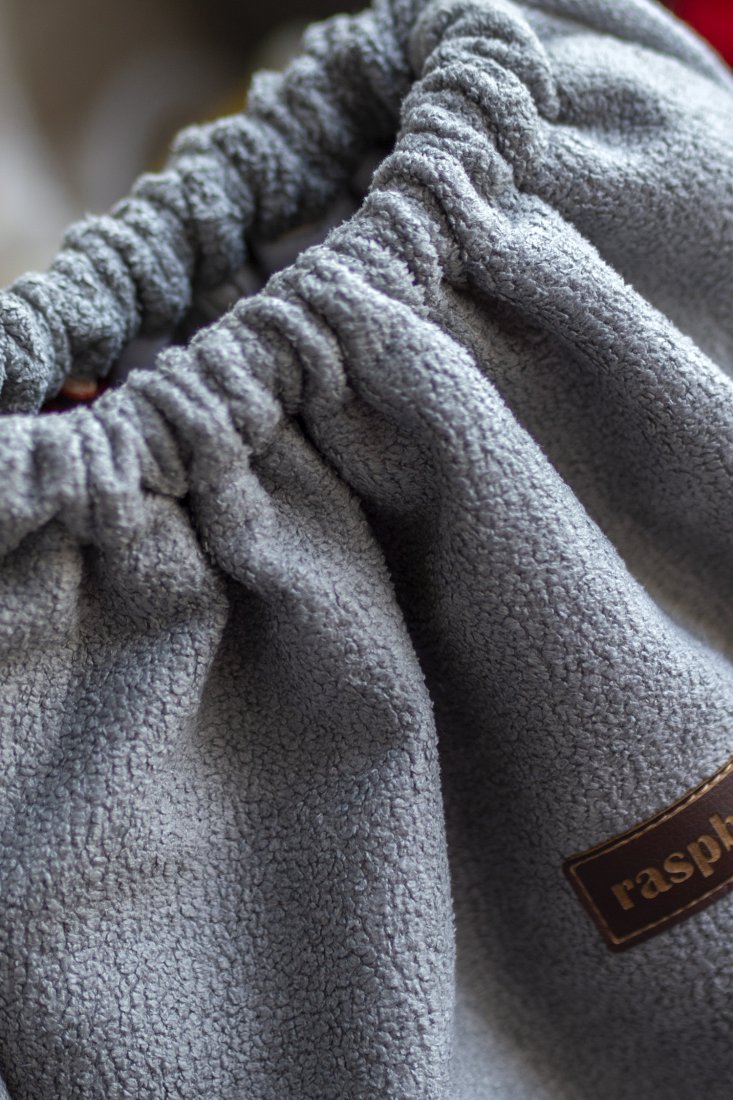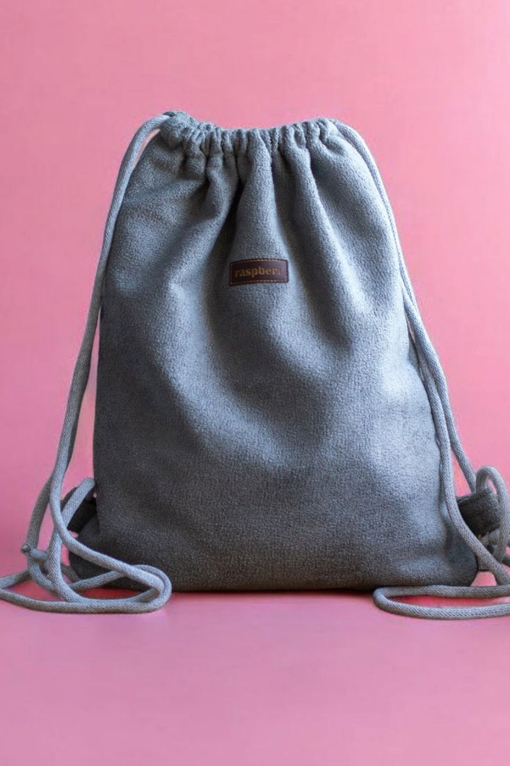 Plecak worek w kolorze szarym wykonany z bukli.
