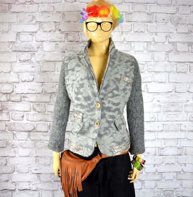 Krótki żakiet w kolorze jasnej szarości punktowo wysadzany małymi srebrnymi cekinami :min przy dolnej i górnej kieszonce, przy ściągaczu, żakiet zapinany na drewniane guziki, posiada kołnierzyk, krój :delikatnie taliowany, wykonany jest z grubszej dzianiny mającej w swoim składzie prawdopodobnie wełnę.Rękawy i tył żakietu prążkowane,przód żakietu w jaśniejsze jakby łatki.Przód żakietu dłuższy, tył nieznacznie krótszy.Żakiet ten dzięki dzianinie z której jest wykonany będzie doskonałą alternatywą dla wiosennego okrycia.Zdjecia nie oddają w pełni jego uroku.