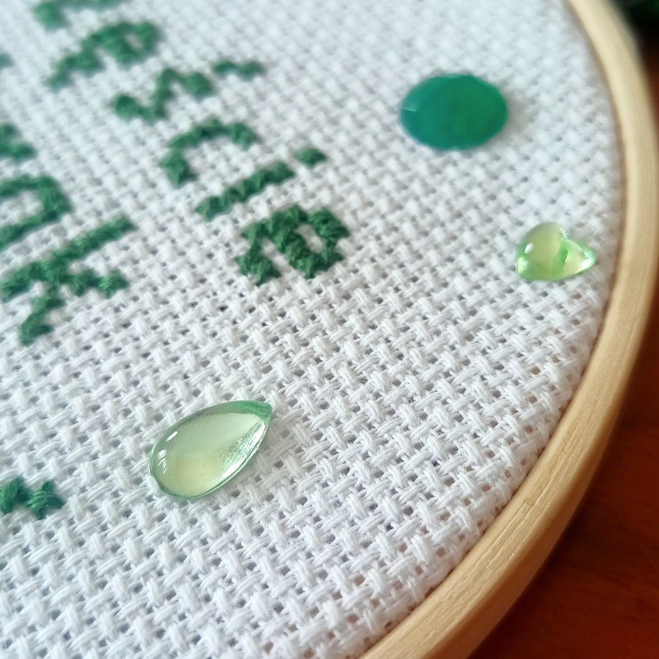 Kanwa bawełniana, nić bawełniana, plastikowe klejnoty, tamborek drewniany, średnica 13,5 cm