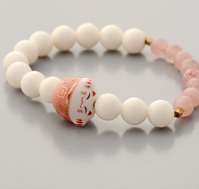 Zabawna, urocza bransoletka wykonana z kulek białego jadeitu (8mm) kilku kulek różowego kwarcu (6mm) elementów miedzianych oraz ceramicznego chińskiego kota szczęścia.