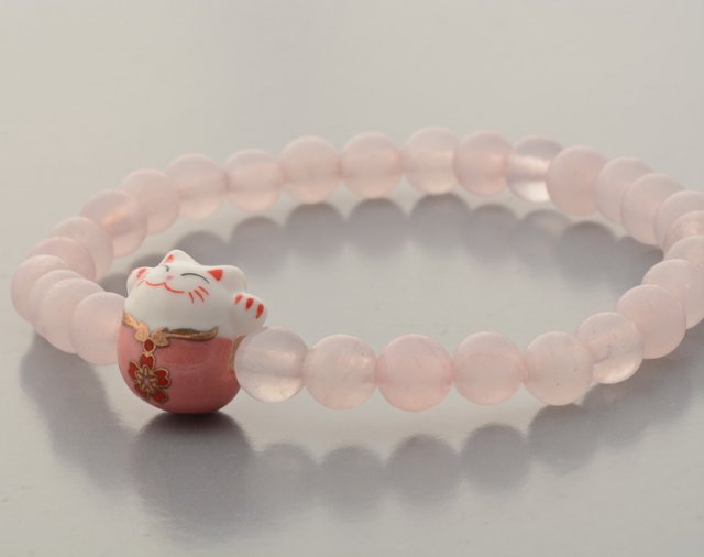 Zabawna, urocza bransoletka wykonana z kulek różowego kwarcu (6mm) oraz ceramicznego chińskiego kota szczęścia.