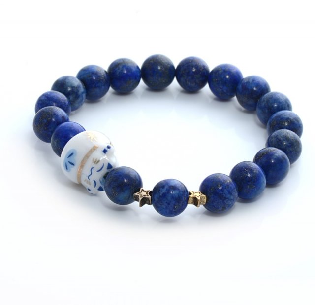 Zabawna, urocza bransoletka wykonana z kulek lapis zazuli (8 mm) dwóch mosiężnych gwiazdek oraz ceramicznego chińskiego kota szczęścia.