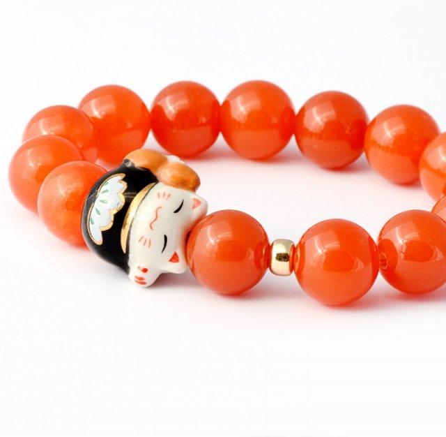 Zabawna, urocza bransoletka XXL, wykonana z dużych kul jadeitu w kolorze pomarańczy (12mm) metalowego elementu w kolorze złotym oraz ceramicznego chińskiego kota szczęścia.