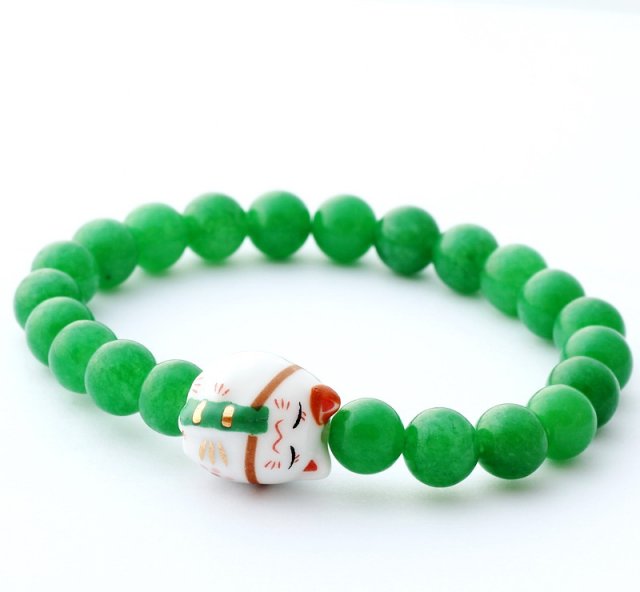 Zabawna, urocza bransoletka wykonana z kulek pięknego zielonego jadeitu (8mm) oraz ceramicznego chińskiego kota szczęścia.