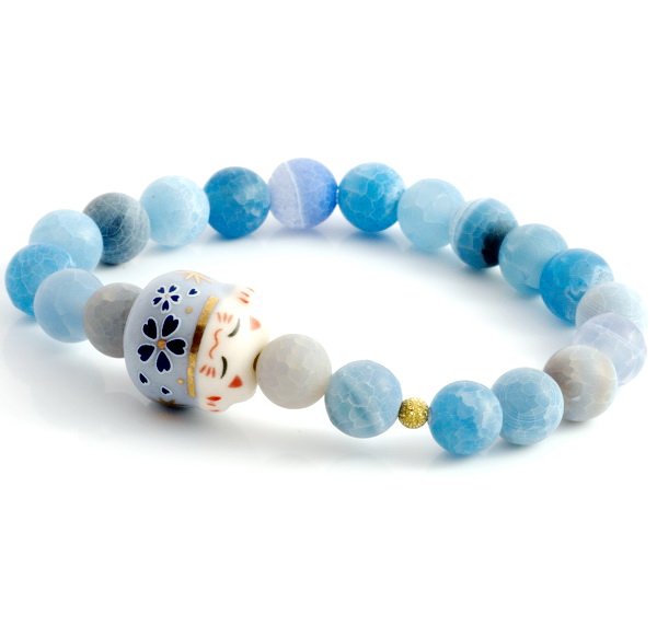 Zabawna, urocza bransoletka wykonana z matowego agatu (8mm) oraz ceramicznego chińskiego kota szczęścia.