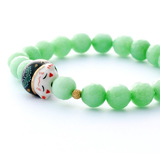 Zabawna, urocza bransoletka wykonana z fasetowanego jadeitu w kolorze miętowo zielonym (8mm) jednej metalowej kuleczki w kolorze złotym oraz ceramicznego chińskiego kota szczęścia.