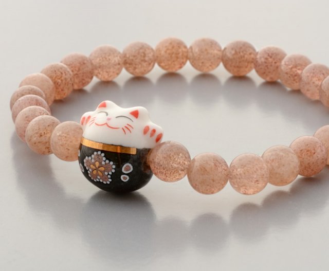 Zabawna, urocza bransoletka wykonana z kulek pięknego kwarcu w kolorze złamanego różu (6mm) oraz ceramicznego chińskiego kota szczęścia.