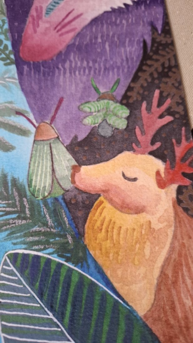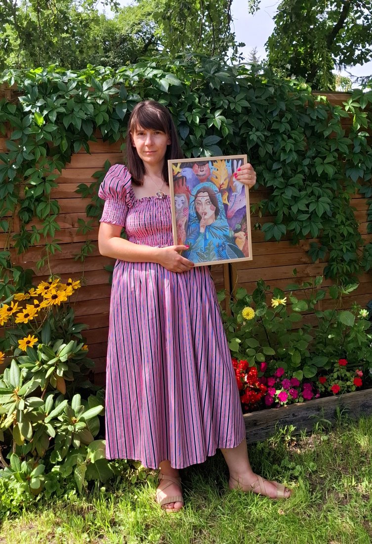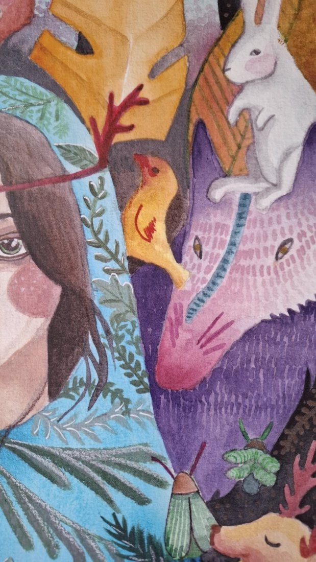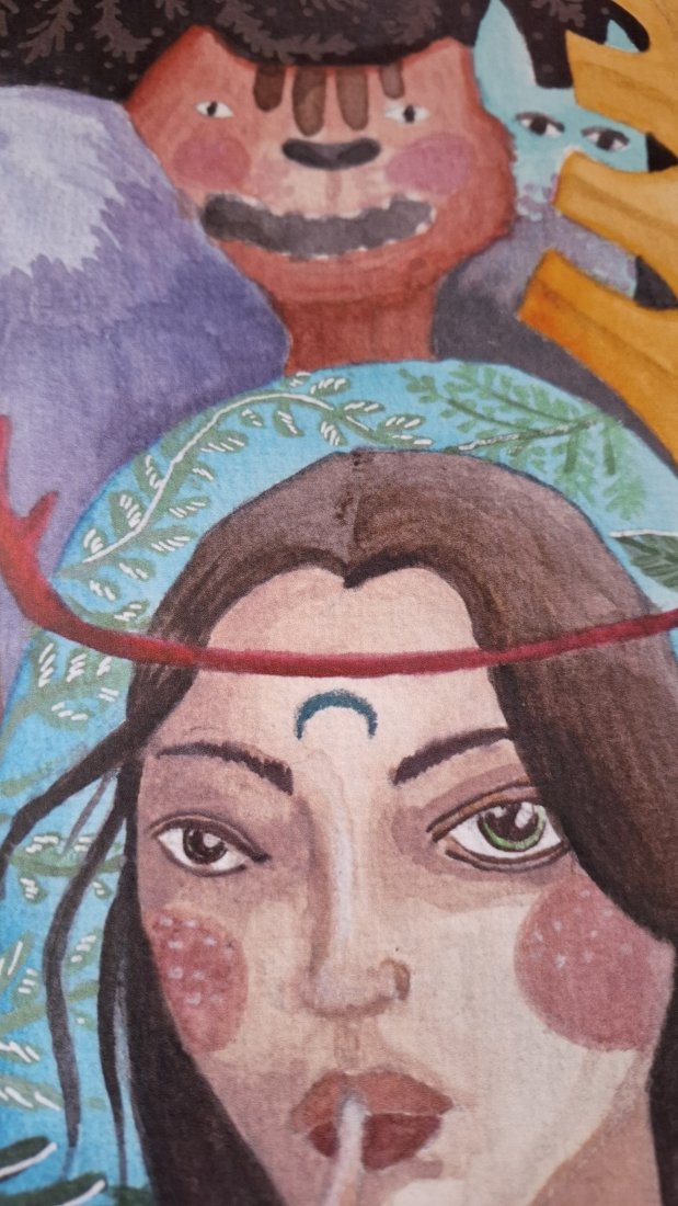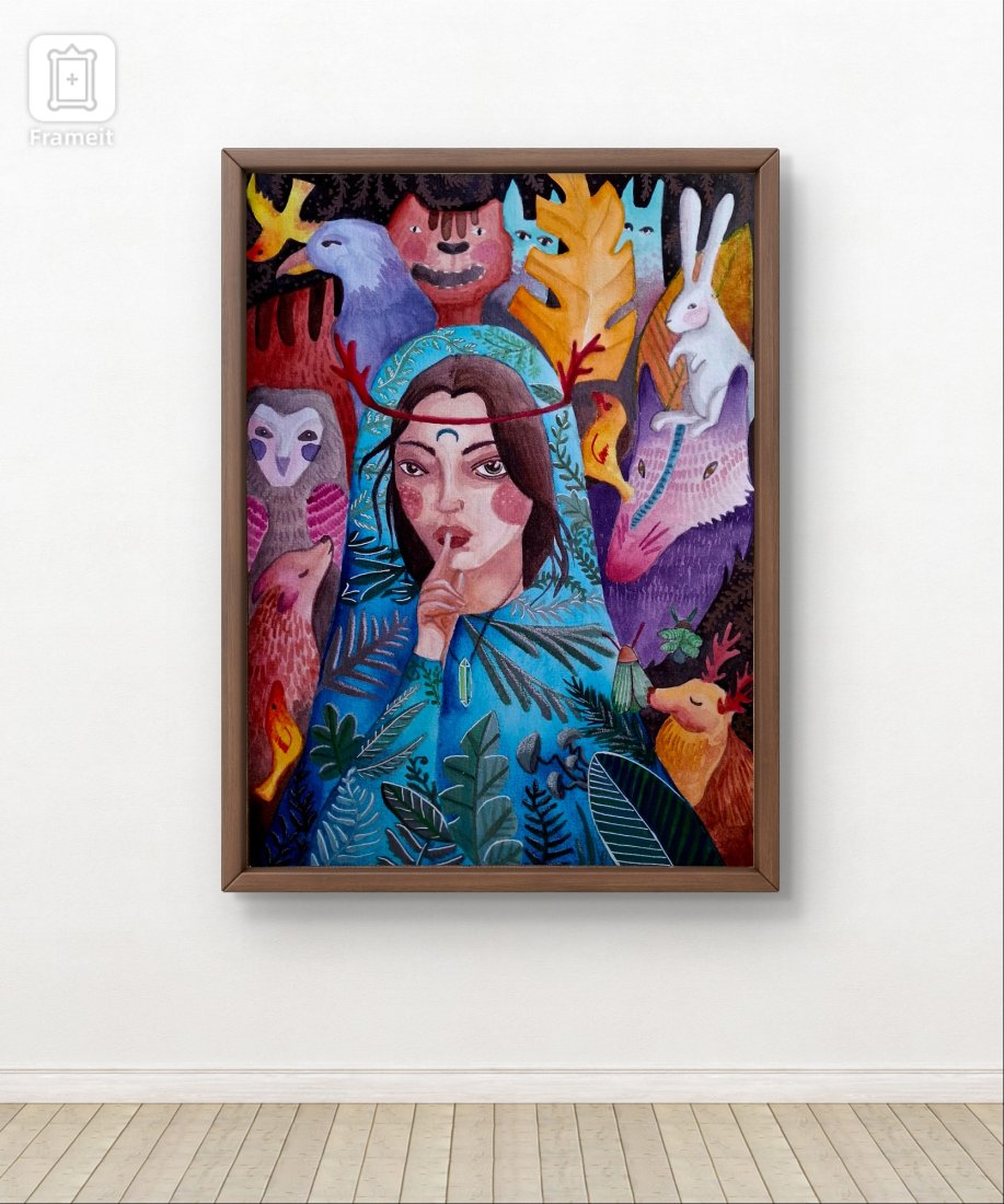 Ta niezwykła ilustracja przedstawia postać Szeptunki – strażniczki Trajkowego Lasu. Kobieta o spokojnym, przenikliwym spojrzeniu, zaklina każde leśne stworzenie. Wokół niej gromadzą się niezwykłe zwierzęta – sowa, jeleń, królik i inne leśne istoty, które symbolizują opiekę i mądrość. Intensywne barwy i bogactwo detali przenoszą widza do baśniowego świata, w którym las tętni życiem i ukrywa swoje sekrety.