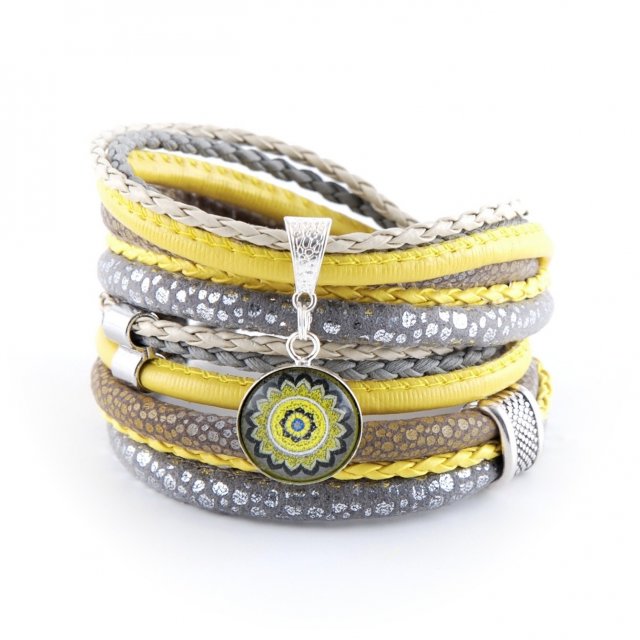 Bransoletka zwijana podwójnie wokół nadgarstka wykonana z wielu rzemyków ze skóry ekologicznej - plecionych oraz miękkich.