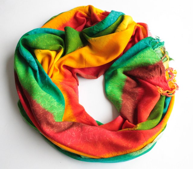 Szeroki szal w pasy w nasyconych kolorach.