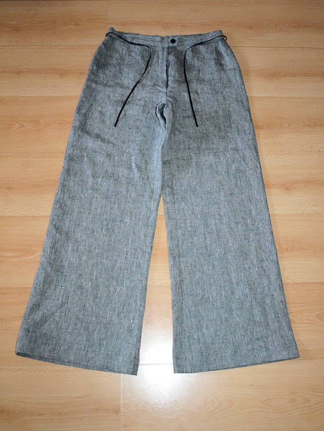 spodnie prawdopodobnie nowe, z szeroką nogawki. Materiał 100% len. kolor jasny szary (pieprz z solą). wyższy stan, w pasie cienki paseczek z ekoskórki. Rozmiar z metki 42, chyba trochę mniejsze. Podaję wymiar mierzone na płasko: