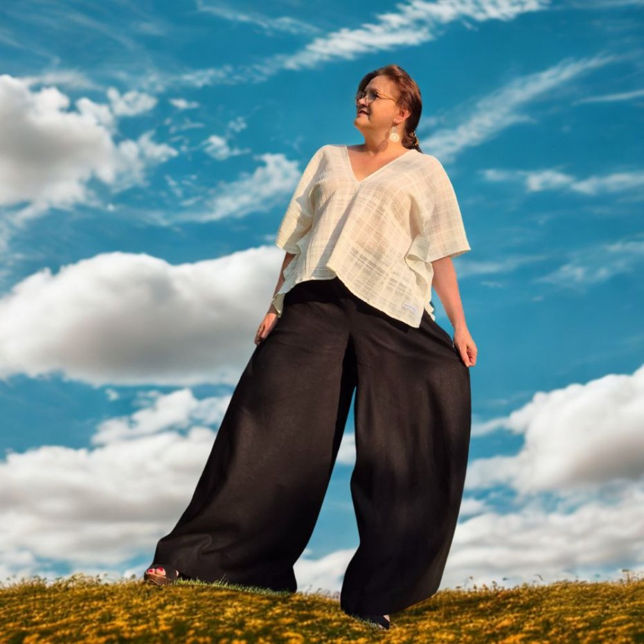 Uszyte z mieszanki lnu i wiskozy – naturalnej, lekkiej, oddychającej. Tkaniny, która przyjemnie otula skórę i pięknie porusza się razem z Tobą. Niezależnie, czy idziesz ulicą, siedzisz w pracy, czy tańczysz w nocy – te spodnie nadążą za Tobą.