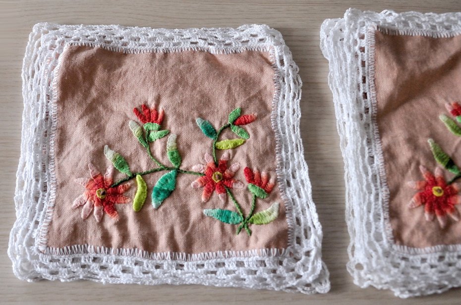 Niezbyt duże płócienne serwetki, ozdobione kwiatowym haftem oraz szydełkową koronką (dookoła), kupione u zdolnej starszej Pani :) Hafty cieniowane, w ciepłych odcieniach zieleni, czerwieni, różu. Samo płótno ma odcień czegoś pomiędzy jasnym brązem a brudnym różem. Serwetki nie są idealnie równe, różną się wielkościami; w sumie jest ich 6. Maja następujące wymiary: