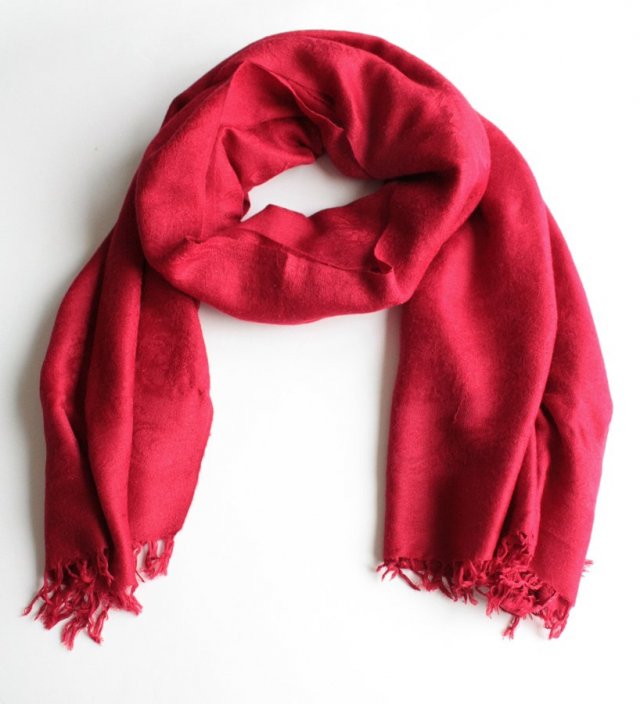 Duży, wytłaczany szal w głębokim odcieniu czerwieni. Materiał oceniam na wiskozę.