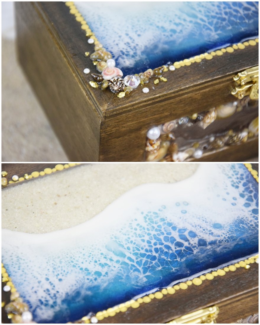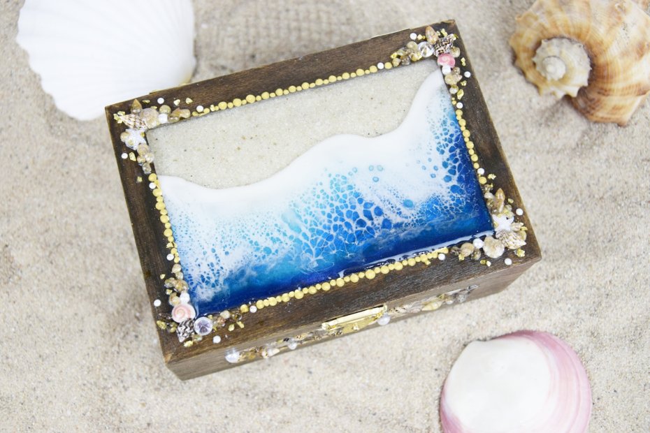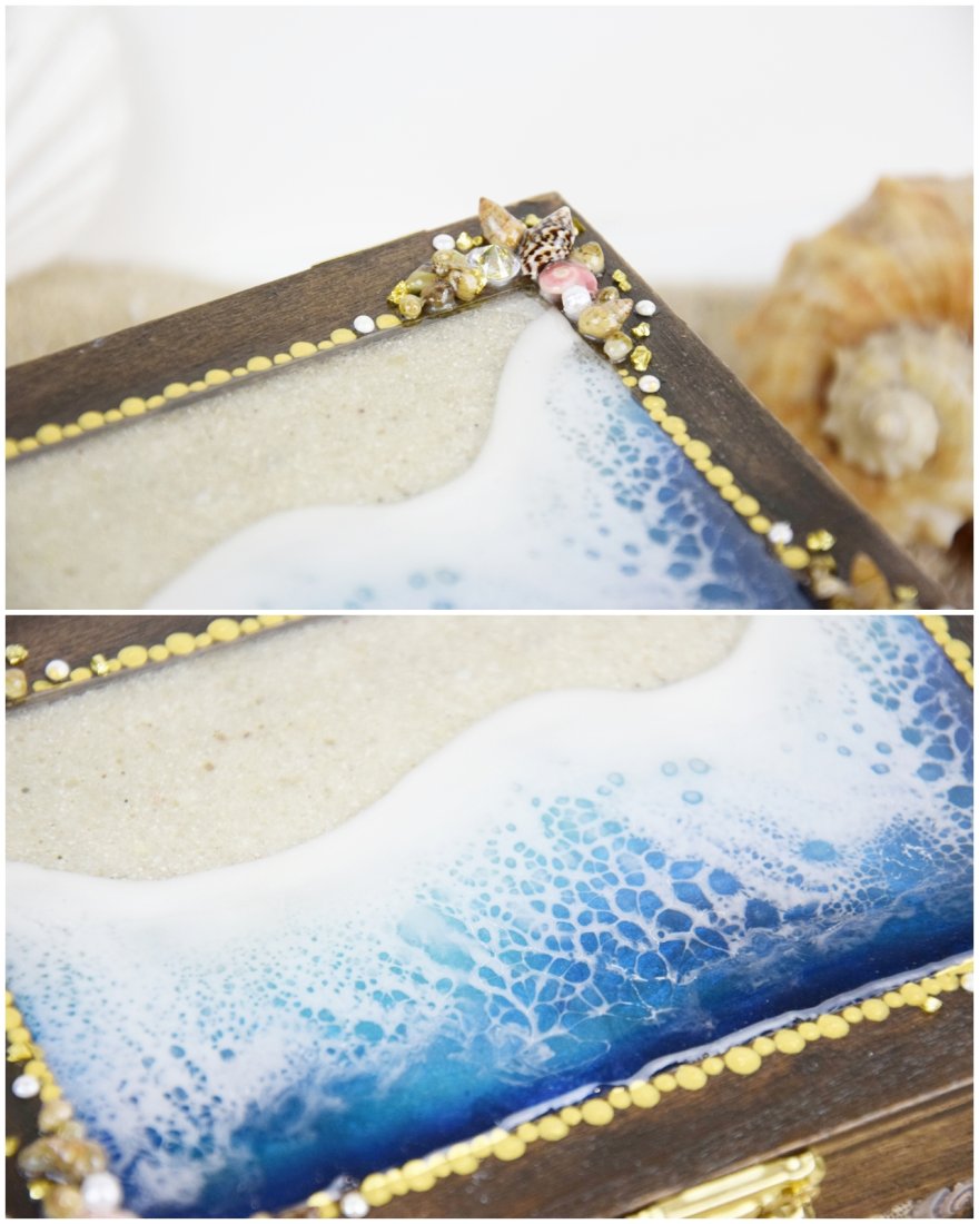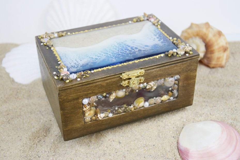 Na pokrywie znajduje się kompozycja o morskim charakterze, zatopiona w przejrzystej żywicy. Otaczają ją prawdziwe muszle, które przywodzą na myśl wakacyjne wspomnienia znad morza.